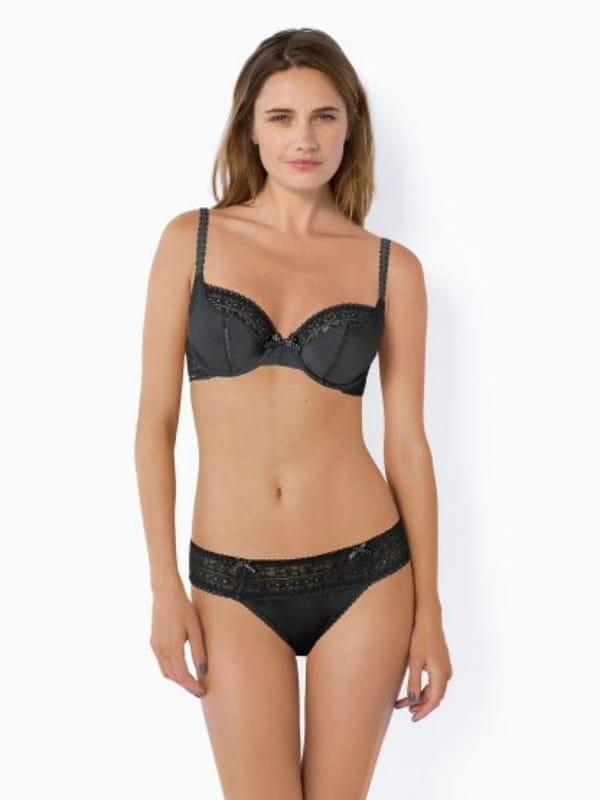 Parure grise satinée en dentelle avec soutien-gorge corbeille et slip de Variance