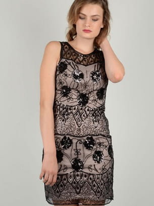 Robe 3 trous en contraste avec ses sequins aux motifs de plumes de paon et sa doublure nude de Molly Bracken