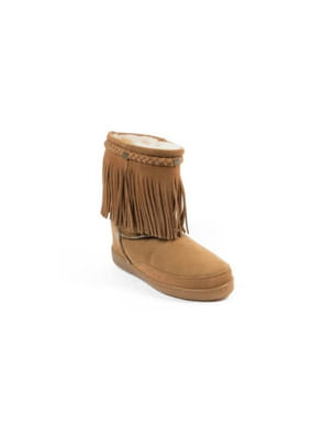 Bottes camel en daim fourrées en mouton avec franges et tresse en détails de Minnetonka