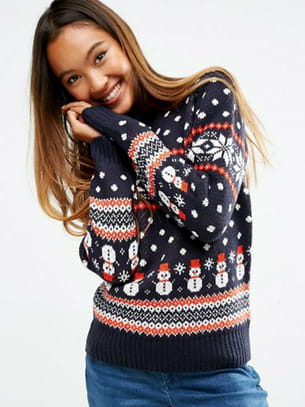 Pull jacquard à motifs bonhommes de neige et flocons bleu marine, blanc et rouge de Asos
