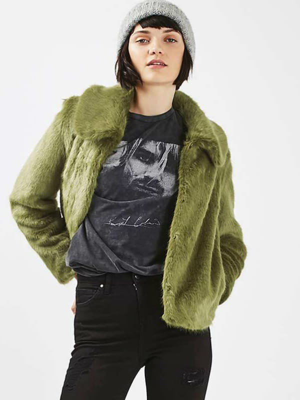 Veste en fausse fourrure courte à col couleur vert olive de Topshop