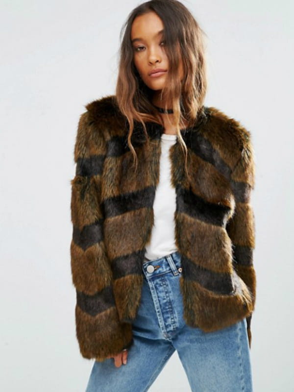 Veste en fausse fourrure courte sans col couleur marron et noir de Asos