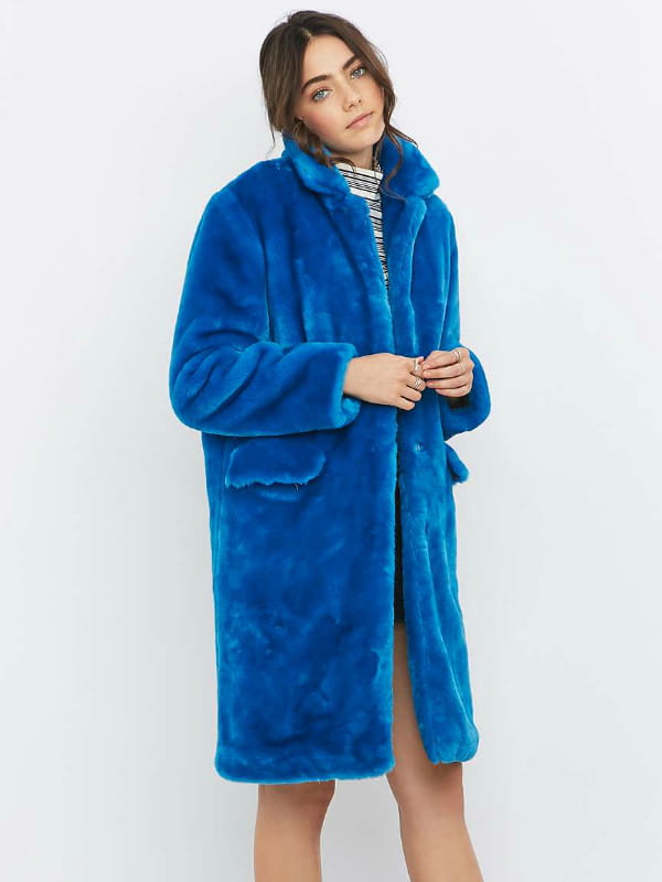 Manteau en fausse fourrure mi long à col couleur bleu électrique de Feamadonna sur Urban Outfitters