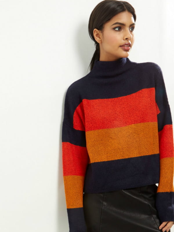 Pull-over bleu marine à grosses rayures multicolores et col cheminé de New Look