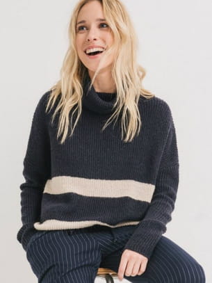 Pull-over bleu marine côtelé avec rayures blanches et col roulé de Promod