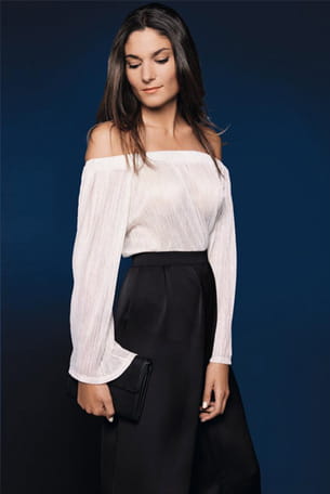 Un fin plissé scintillant et des épaules dénudées : cette blouse (15€) a le combo gagnant ! Alors si, comme June Sixty Five, on la marie avec le pantalon tailleur large (20 €), on atteint des sommets. Pour équilibrer les volumes et élancer la silhouette, on opte pour des escarpins à talon fin, et pour la touche de féminité en plus, des créoles et une pochette noire.