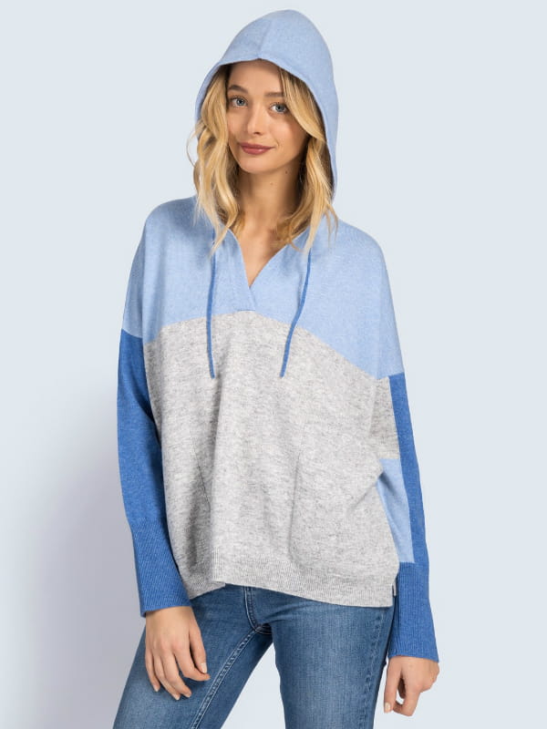 Sweat-shirt bleu et gris en cachemire avec capuche et cordons de serrage de Kujten