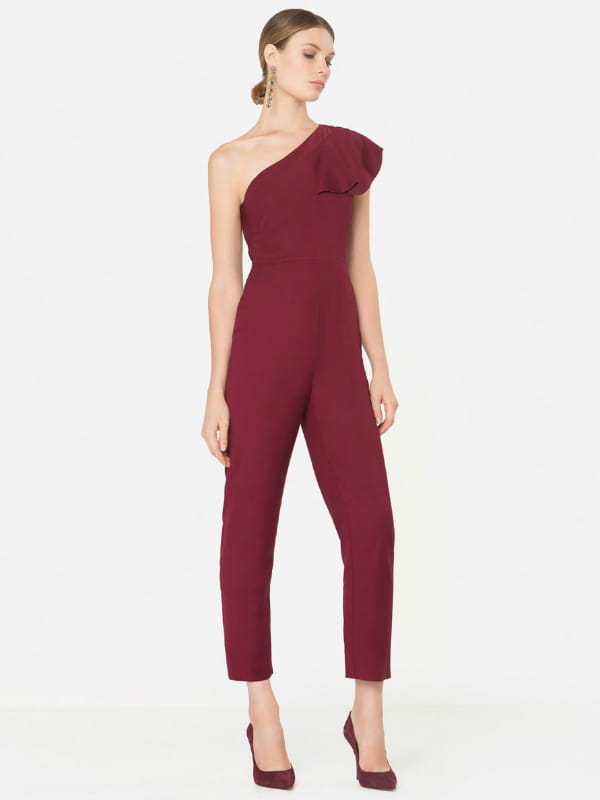 Combinaison pantalon one shoulder à volant bordeaux de Uterque
