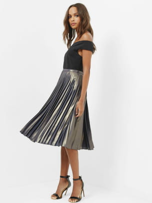 Crop top bateau noir et jupe plissée midi argentée de Ted Baker