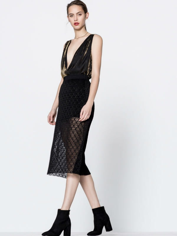 Jupe en dentelle ajourée noire et body en lurex doré de Pull & Bear