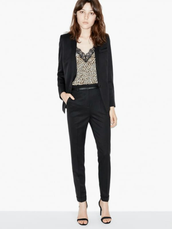 Pantalon détails cuir et veste noire, top léopard et dentelle de The Kooples