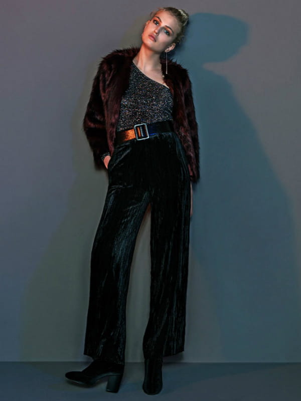 Pantalon velvet, top asymétrique et fourrure de Stradivarius © Stradivarius