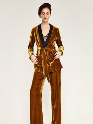 Ensemble pantalon large et veste peignoir ceinturée en velours doré de Zara