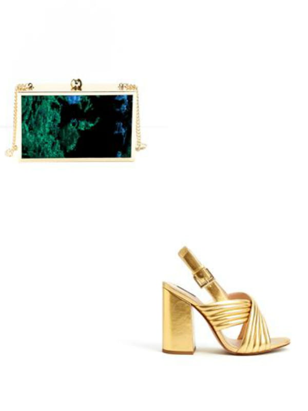 Pochette rigide dorée avec tissu velours vert de & Other Stories et sandales dorées avec talon large de Mango