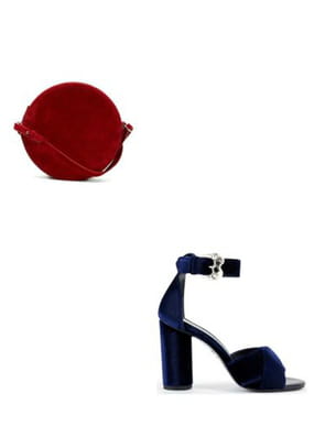 Sac rouge en daim de forme ronde de Cos et sandales bleu nuit en velours avec large talon de Maje