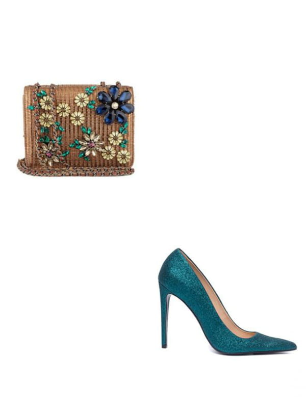 Sac beige en raphia orné de fleurs multicolores en strass de Essentiel et escarpins bleu canard à paillettes de Tara Jarmon