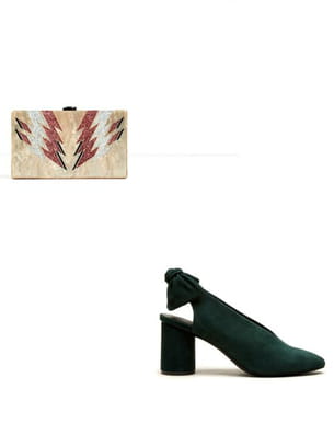 Clutch avec détails brillants en forme d'éclairs de Zara et escarpins verts en suède ouverts à l'arrière avec nœud de Cos