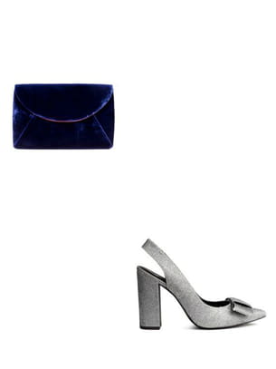 Pochette bleu nuit en velours de Boden et escarpins argentés avec nœud de H&M