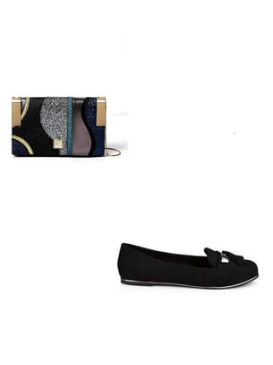 Pochette paillettes de River Island et mocassins noirs de New Look © River Island/New Look