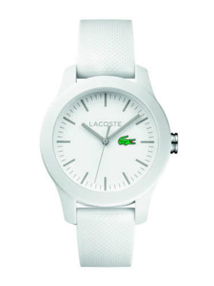 Montre cadran 43 mm et fond blanc, bracelet blanc en silicone de Lacoste