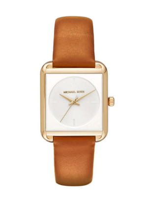 Montre cadran doré 32 mm, fond blanc et bracelet cuir camel de Michael Kors sur galerieslafayette.com