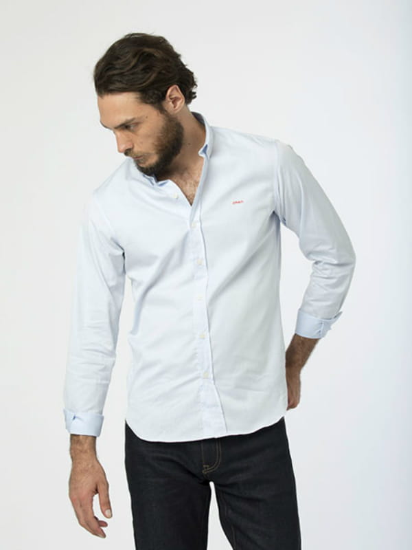 Chemise bleu ciel en coton avec "amour" brodé en rouge sur la gauche de Maison Labiche
