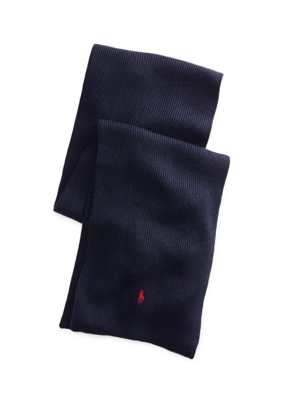 Écharpe bleu marine en laine côtelée avec logo rouge brodé de Ralph Lauren