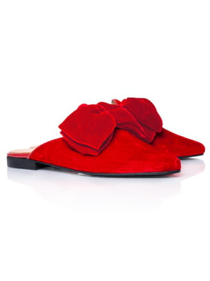 Mules en velours rouge vermillon avec noeud oversized dessinées par Elisabeth von Thurn und Taxis de Chatelles