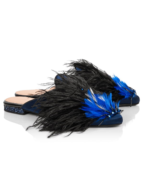 Mules en satin bleu avec plumes d'autruche, perles et talons à paillettes bleu marine de Chatelles x Elisabeth Thurn und Taxis