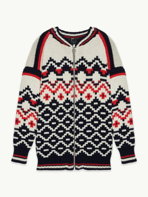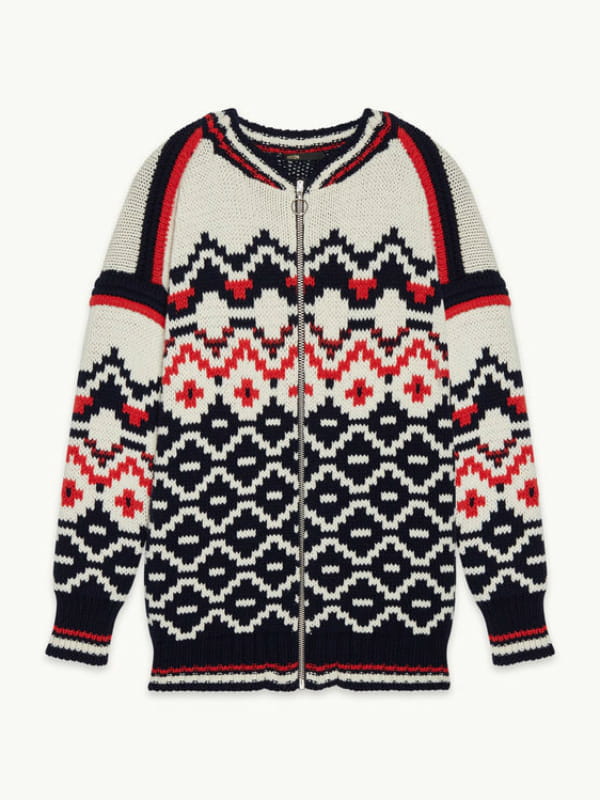 Cardigan bleu blanc rouge en maille jacquard de Maje