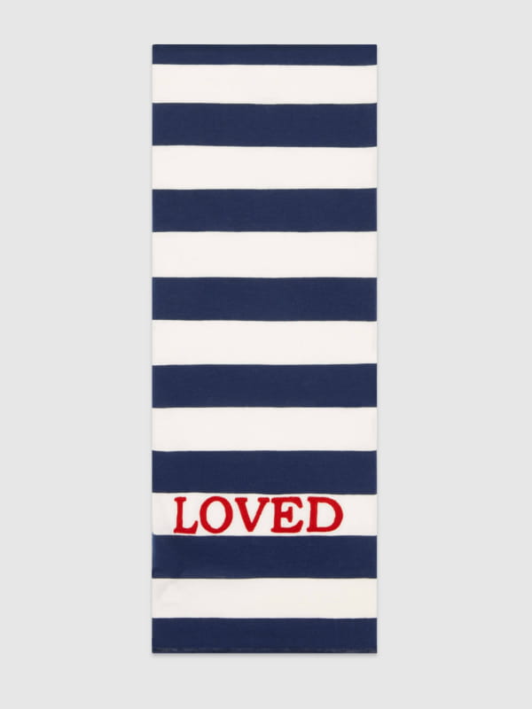 Écharpe blanche en coton à rayures bleues avec message rouge brodé de Gucci