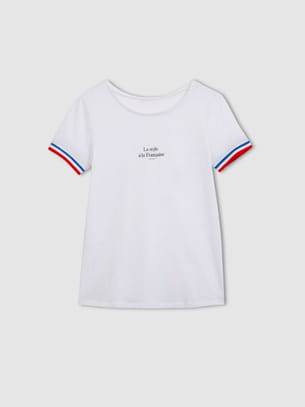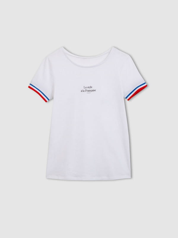 T-shirt blanc avec liserés bleu blanc rouge et phrase imprimée au centre de R Studio chez La Redoute