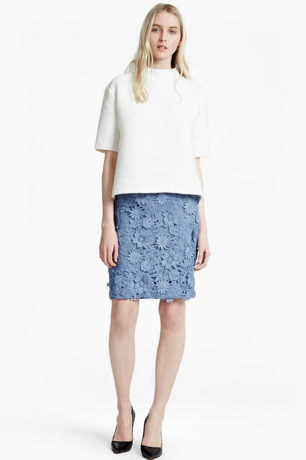 Top en jersey à col montant cru et jupe crayon bleu ciel en dentelle 3D de French Connection