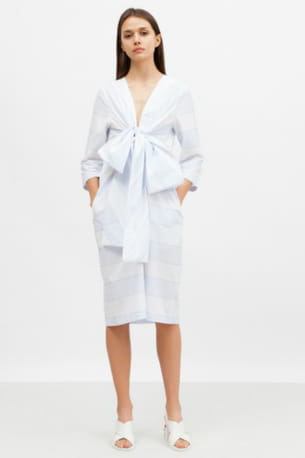Robe courte en coton rayé à nouer à l'encolure bleu ciel et blanche de Paul & Joe