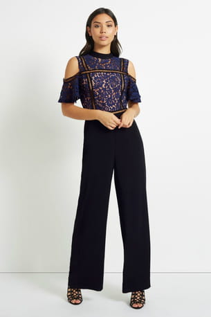 Combinaison pantalon large avec haut en guipure bleu marine de Fashion union chez Lipsy