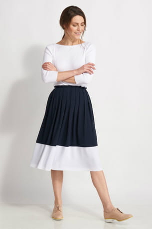 Jupe midi bicolore bleu marine et blanche et pull fin manches 3/4 blanc de Burton