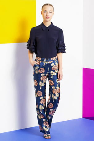 Chemise en crêpe de soie à 3 rangées de volants sur chaque manche marine et Pantalon fluide imprimé fleurs de Tara Jarmon