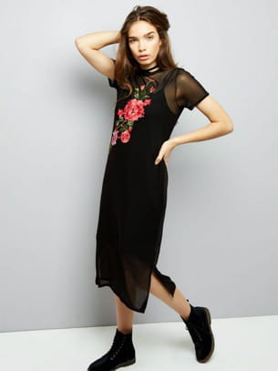Robe noire en tulle avec écusson fleuri de New Look