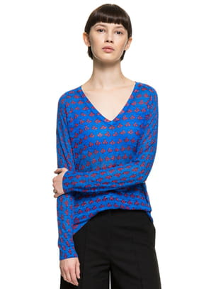 Pull bleu électrique imprimé d'un motif rouge et col V de Bimba Y Lola
