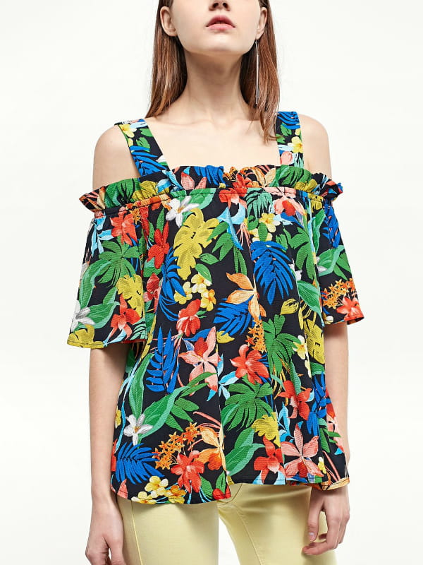 Top froncé à larges bretelles imprimé hawaïen multicolore de Stradivarius
