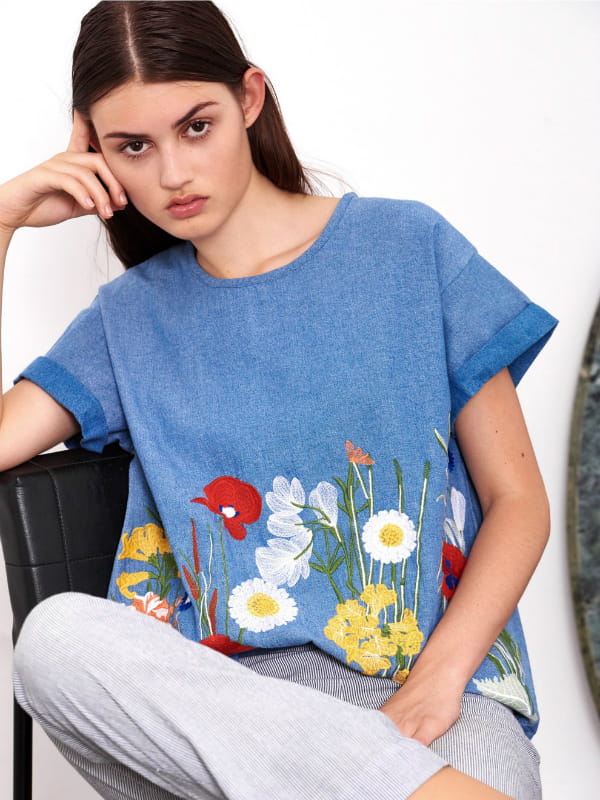 T-shirt denim brodé de fleurs de Valentine Gauthier