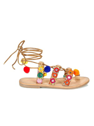 Sandales en cuir plates à lacet et pompons multicolores  de Les Tropéziennes par M Belarbi sur Spartoo