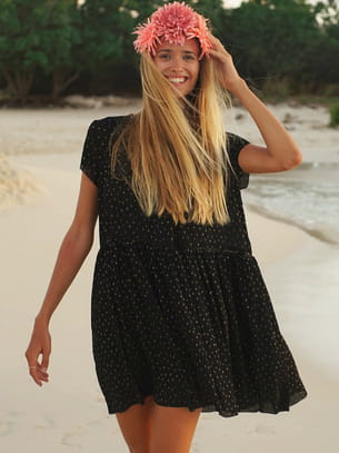 Robe courte ample et noire à manches courtes avec détails imprimés dorés de Amenapih