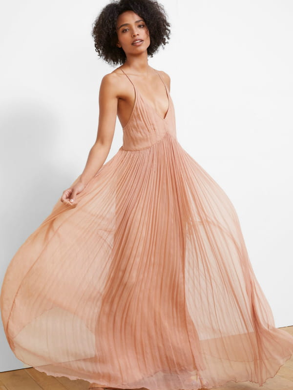 Robe longue nude ultra fluide et drapée à fines bretelles et décolleté en V plongeant de Mes Demoiselles