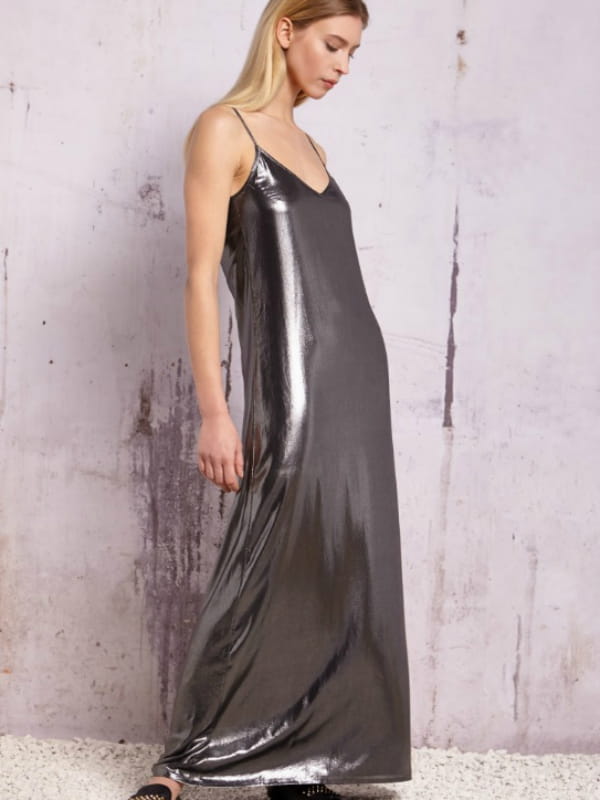 Slip dress longue et ample à fines bretelles argentée de Swildens