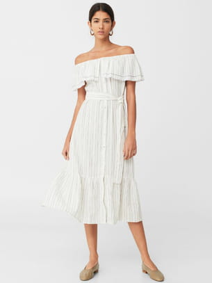 Robe mi-longue à épaules dénudées blanches à fines rayures noires et ceinture de Mango