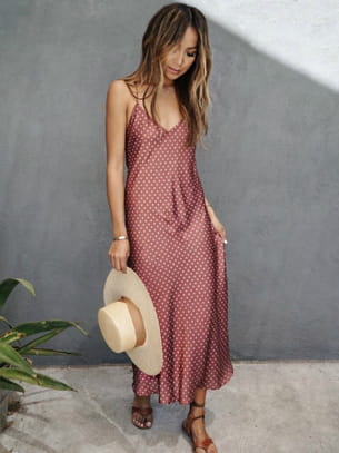 Slip dress longue à fines bretelles et dos-nu rose vieilli à pois blancs de Sincerely Jules