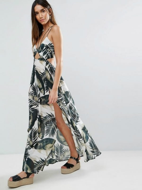 Robe longue fendue blanche et verte à imprimé feuilles de palmier avec découpe sous la poitrine et très fines bretelles de Asos