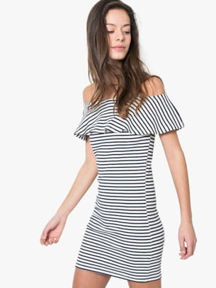 Robe courte moulante blanche à fines rayures noires avec encolure Bardot de Gémo