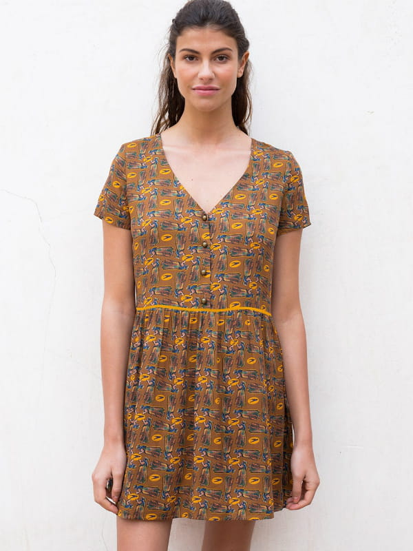 Robe courte fluide imprimé oiseaux marron de Soi Paris